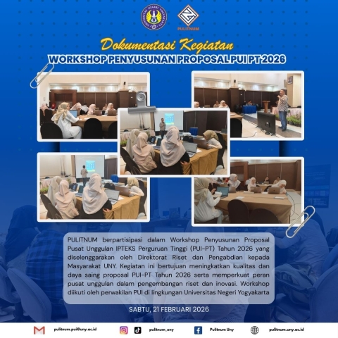 Pusat Unggulan Literasi dan Numerasi (PULITNUM) turut berpartisipasi dalam Workshop Penyusunan Proposal Pusat Unggulan IPTEKS Perguruan Tinggi (PUI-PT) Tahun 2026 yang diselenggarakan oleh Direktorat Riset dan Pengabdian kepada Masyarakat UNY pada Sabtu, 21 Februari 2026. Kegiatan ini berlangsung di Hotel UNY, Karangmalang, Sleman, Daerah Istimewa Yogyakarta.